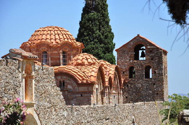 Il mattino seguente, pensiamo esclusivamente al viaggio itinerante che ci aspetta. Lasciamo la costa e seguiamo una bella strada, che si snoda salendo attraverso verdi colline, il versante opposto però, è molto più brullo e rapidamente scendiamo a Sparta, dove non è rimasto gran che da vedere; Ma qui la vera attrattiva è Mistra. Vista l'ora, ci fermiamo a pranzo in un quasi deserto ristorantino, proprio sotto la collina su cui sorge l'antica città. Fortunatamente, il servizio è veloce, perchè arriviamo all'ingresso del sito appena in tempo. Con la crisi che morde, hanno tagliato i fondi e alle 15:30 chiude.